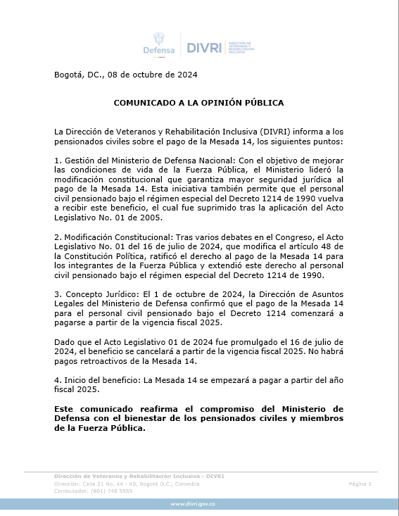 La Dirección de Veteranos y Rehabilitación Inclusiva, DIVRI, se permite compartir la siguiente información relacionada con la mesada 14 para civiles pensionados del Ministerio de Defensa Nacional: